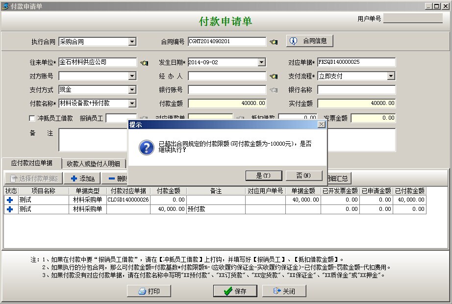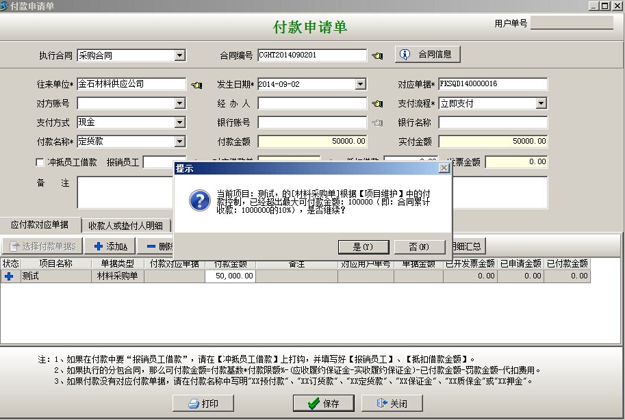 備注:上圖提示為預(yù)防超額付款的合同明細(xì)提示,點(diǎn)確定即可。