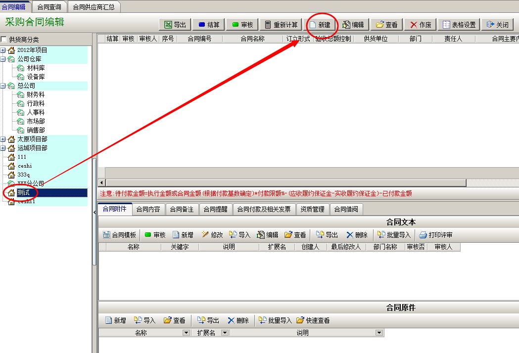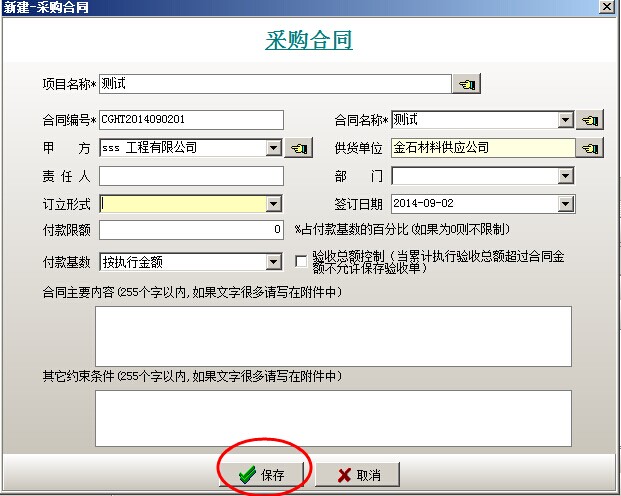 打開(kāi)采購(gòu)合同,左側(cè)選擇相應(yīng)的項(xiàng)目,右邊點(diǎn)新建,錄入采購(gòu)合同相關(guān)信息,保存。
