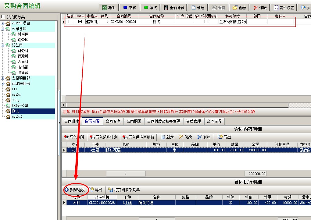 打開(kāi)采購(gòu)合同內(nèi)容,點(diǎn)擊合同執(zhí)行明細(xì)的[到貨驗(yàn)收]