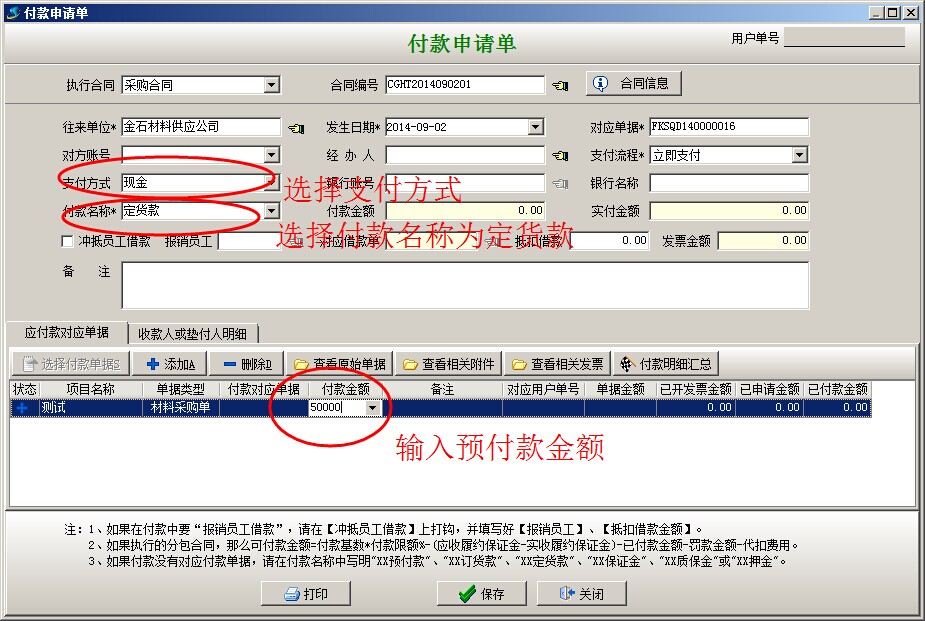 注:因?yàn)闆](méi)有到貨驗(yàn)收入庫(kù),所有付款名稱(chēng)要為:“定貨款”、“訂貨款”、“預(yù)支款”、“預(yù)付款”,并且要對(duì)應(yīng)好合同編號(hào)(系統(tǒng)規(guī)定必須有合同才能做預(yù)付款或定金等付款)。