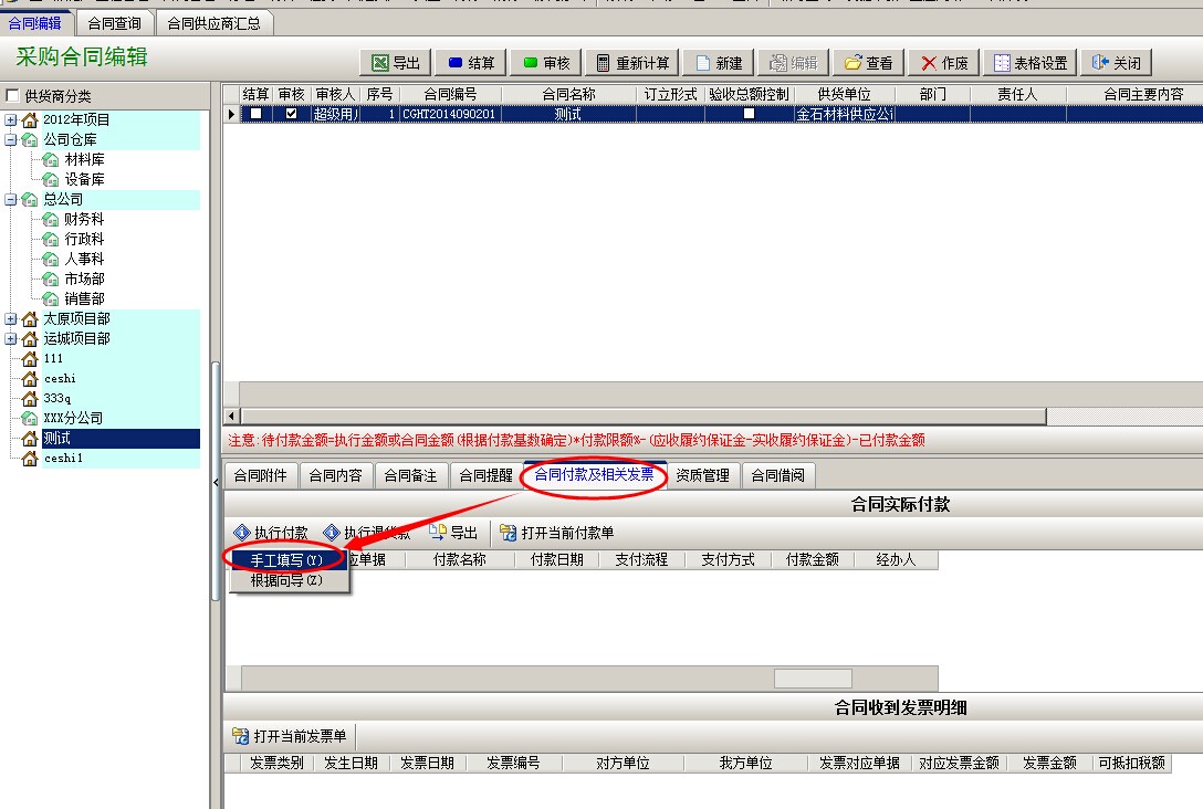 合同內(nèi)容錄入完畢,審核采購(gòu)合同,在沒(méi)有執(zhí)行到貨驗(yàn)收的情況下,點(diǎn)擊合同付款及相關(guān)發(fā)票,執(zhí)行付款,選擇手工填寫(xiě),彈出付款申請(qǐng)單,選擇付款方式,付款明細(xì)中輸入付款金額,然后保存 。