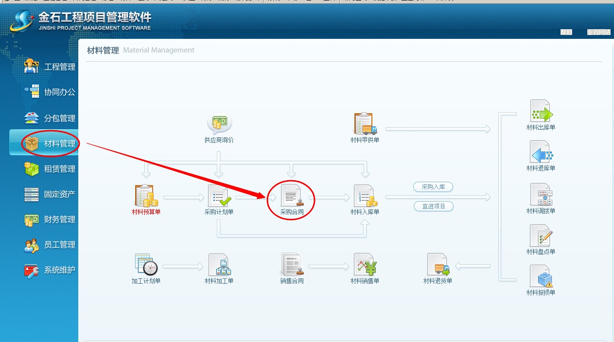 ①簽訂采購(gòu)合同先付的預(yù)付款錄入:打開(kāi)軟件導(dǎo)航欄材料管理-----采購(gòu)合同