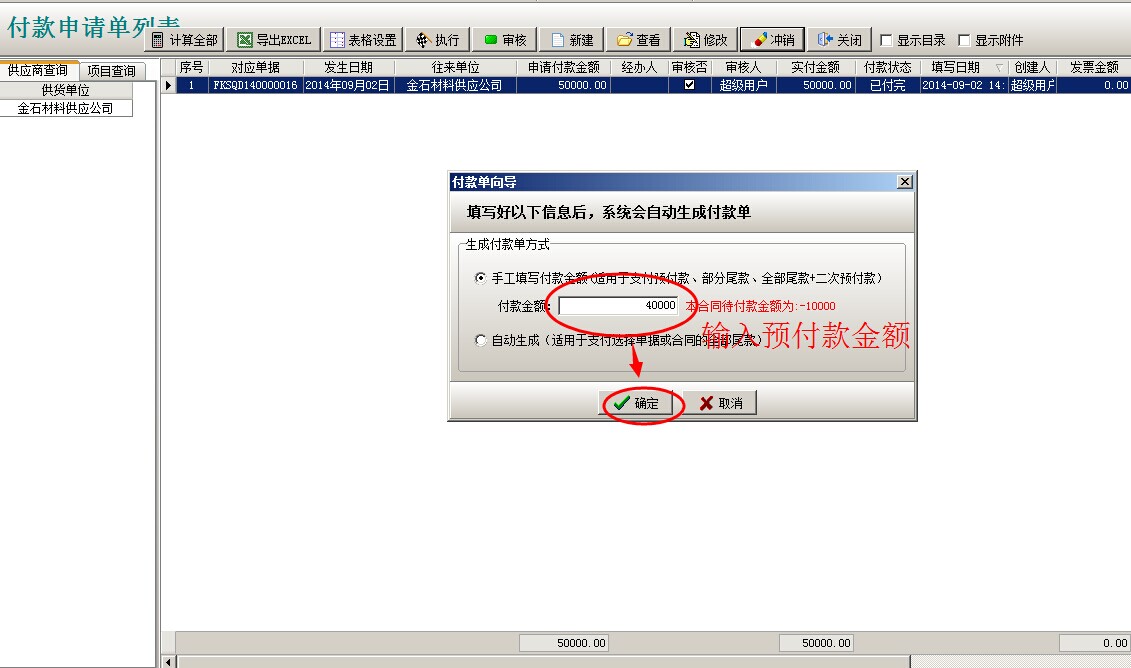 注:以上操作完成了預(yù)付款申請(qǐng)50000,付款50000。
