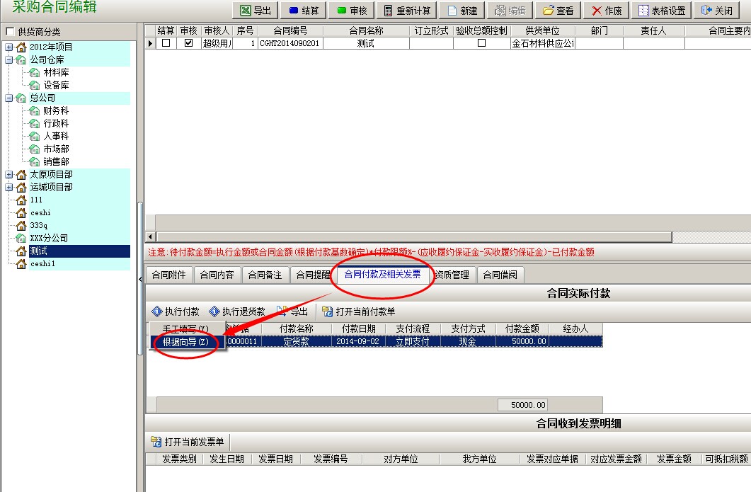 如果再有付款的情況,我們做【采購(gòu)合同】->【合同付款及相關(guān)發(fā)票】->【到貨驗(yàn)收】->【合同付款】->【根據(jù)向?qū)А俊?/span>