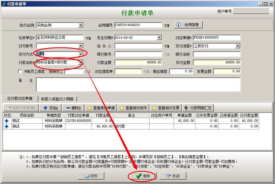 注:上圖所示;付款申請(qǐng)單的兩行明細(xì)為兩個(gè)材料采購(gòu)單,第一行的[付款對(duì)應(yīng)單據(jù)]為CLCGD140000026已付款金額40000已經(jīng)等于單據(jù)金額(表示該采購(gòu)單已經(jīng)付完,是通過(guò)上一個(gè)付款單自動(dòng)對(duì)應(yīng)上的付款數(shù)),所以付款金額為0,第二行的[付款對(duì)應(yīng)單據(jù)]為空,表示本項(xiàng)支付的款項(xiàng)為預(yù)付款),上面的付款名稱(chēng)為材料設(shè)備款+預(yù)付款;