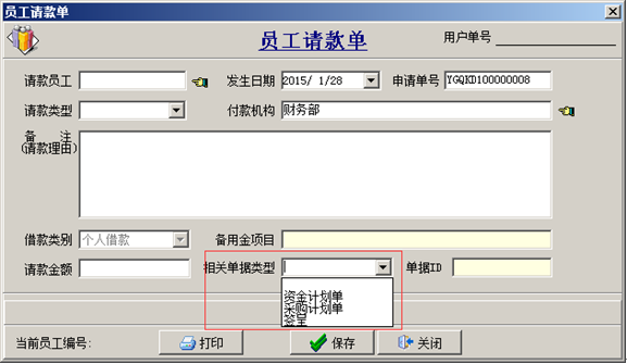這時的【員工請款單】較為簡單,只提供了備注、與附件功能,給審核該單據(jù)的管理人員造成了一定的難度。為了解決這一問題軟件改進了【員工請款單】給請款單中增加了三個來源:【資金計劃單】、【采購計劃單】、【簽呈】,以方便在員工請款審核中,查看請款理由是否合理。其中【采購計劃單】和【簽呈】是軟件中一直存在的模塊,直接關(guān)聯(lián)的計劃單號和簽呈單ID。