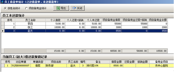 付款申請單填寫完畢后,需要多級審核通過,審核通過后由財務(wù)執(zhí)行生產(chǎn)付款單,當(dāng)付款單生成完畢后,我們可以查看員工借款單統(tǒng)計,其中趙大的借款中,報銷一欄出現(xiàn)8500,,說明已經(jīng)報銷完畢。如下圖: