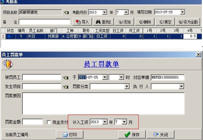 1. 【員工工資】可用于統(tǒng)計公司管理人員、項(xiàng)目管理人員等固定工作人員的工資成本。員工工資表是根據(jù)員工考勤表生成,每個項(xiàng)目的考勤可以單獨(dú)錄入,但一個月份只能生成一張工資表。員工考勤的錄入比較簡單,是按數(shù)字表示出勤情況的,全勤填寫1、半勤填0.5、缺勤填0。如果有遲到、早退、曠工等情況可以填寫員工罰款單來進(jìn)行扣工資。