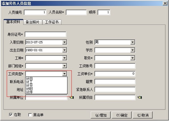 2. 【勞務(wù)工資】可用于統(tǒng)計公司非固定的工作人員,或其他勞務(wù)公司的工人工資,勞務(wù)工資計算方式可選計日、記工、計分、計時、計件(在添加勞務(wù)人員信息時設(shè)置)。