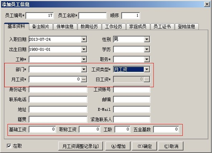 員工工資的計算方式有月工資和日工資兩種方式(在員工維護(hù)中設(shè)置),按月工資計算時工資不受考勤影響,按日工資計算時,員工工資等于日工資乘以考勤天數(shù)。以上計算得出的是應(yīng)發(fā)工資,用戶還要根據(jù)自己的實(shí)際情況來編輯公式,得出實(shí)發(fā)工資。下圖所示:員工維護(hù)中有每個員工固定的月工資、日工資、基礎(chǔ)工資、職稱工資等。