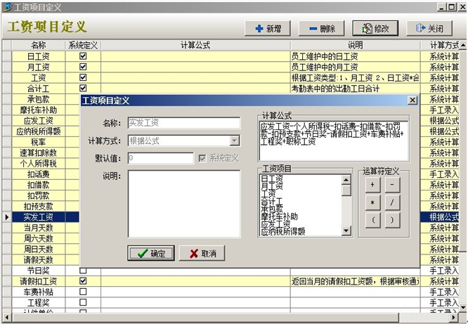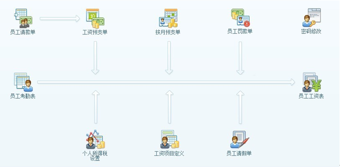 除此之外,還有根據(jù)系統(tǒng)中各業(yè)務(wù)單據(jù)自動計算的扣工資預(yù)支、扣員工借款、扣罰款、員工請假單中請假扣工資等,還有需要手工添加的在工資項(xiàng)目定義中各種扣款、補(bǔ)助等。