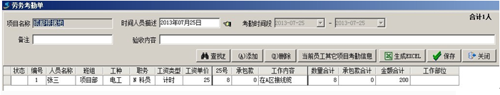 在勞務(wù)考勤中,記錄的內(nèi)容主要包括:當(dāng)前日期的出勤情況、工作內(nèi)容。如下圖所示:員工張三在7月25日,考勤數(shù)為8,工作內(nèi)容為,在A區(qū)接線纜。他的工資類型屬于計時,所以8代表8小時,他當(dāng)天的工資為:25乘以8=200。除正常的考勤外還有承包款一項(xiàng),一般是記錄員工當(dāng)天的補(bǔ)助或加班費(fèi)等。