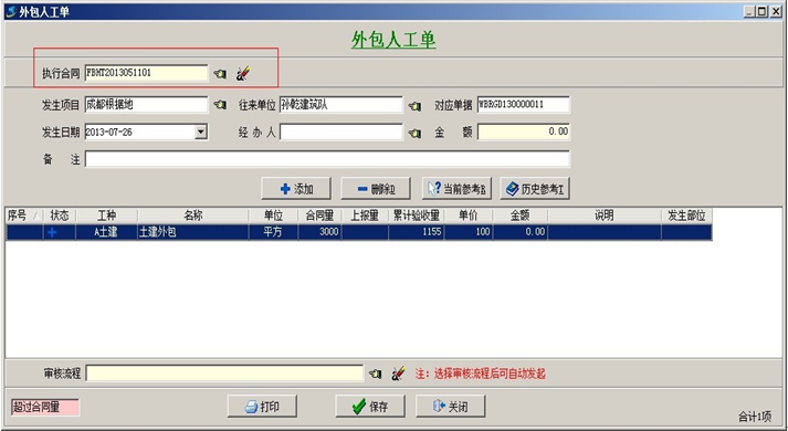 合同驗(yàn)收和合同外零、點(diǎn)工驗(yàn)收,都要建立外包人工單,兩者的區(qū)別在于,前者在外包人工單中執(zhí)行的合同(可以讀取到合同內(nèi)的相關(guān)信息,如合同量、上報量等),后者在外包人工單中未執(zhí)行合同。