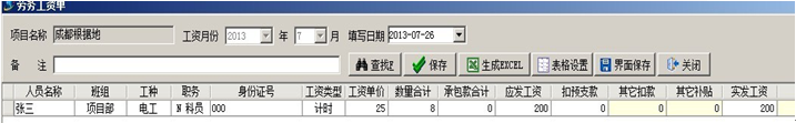 如果勞務(wù)工人有預(yù)支工資的情況,可以記錄在勞務(wù)預(yù)支單里,在生成工資表時,系統(tǒng)自動計算扣預(yù)支款,另外生成工資表時還有承包款合計以及兩項(xiàng)可以手動添加的款項(xiàng):其他扣款和其他補(bǔ)貼。