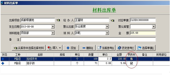 4. 【材料出庫單】出庫單明細(xì)中所有的材料都進(jìn)入出庫單中選擇出庫項(xiàng)目的成本。