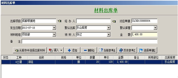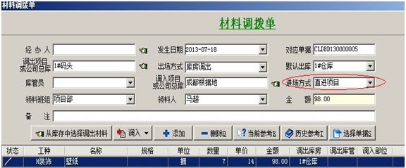 3. 【材料調(diào)撥單】主要用于:項(xiàng)目與項(xiàng)目之間的材料調(diào)撥,或公司總庫與項(xiàng)目之間的材料調(diào)撥。在填寫時(shí)要選擇好調(diào)出項(xiàng)目和調(diào)入項(xiàng)目。調(diào)出項(xiàng)目有兩種出場方式:庫房調(diào)出和班組繳料,調(diào)入項(xiàng)目有兩種進(jìn)場方式:調(diào)撥入庫和直進(jìn)項(xiàng)目。進(jìn)場方式選擇直進(jìn)項(xiàng)目時(shí),明細(xì)中的材料金額會進(jìn)入調(diào)入項(xiàng)目的成本中。如果調(diào)出項(xiàng)目,出場方式選擇的是班組繳料,也就是從項(xiàng)目現(xiàn)場直接調(diào)出的,這時(shí)調(diào)出項(xiàng)目的成本中會減去明細(xì)中材料的金額。
