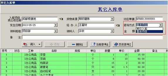 1. 【其他入庫單】一般用在期初庫存輸入或材料來源不牽扯應(yīng)付賬款的情況。在填寫其他入庫單時(shí)進(jìn)場方式選擇:直進(jìn)項(xiàng)目,那么單據(jù)明細(xì)中材料的金額會直接進(jìn)入單據(jù)所選擇的項(xiàng)目成本中。如果選擇了其他入庫,那么這批材料的金額不會直接反映到項(xiàng)目成本中,這批材料必須出庫后才會進(jìn)入項(xiàng)目成本(這批材料的成本以出庫時(shí)所填寫單據(jù)中的金額為準(zhǔn))。