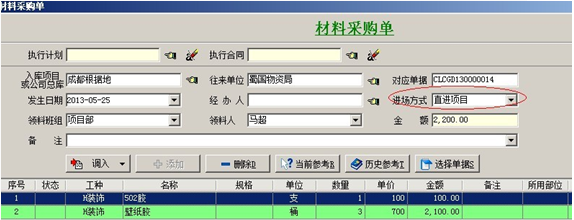 2. 【材料采購單】也稱為:材料驗(yàn)收單、材料入庫單,是材料采購時(shí),材料到達(dá)現(xiàn)場后要填寫的單據(jù)。在單據(jù)填寫時(shí)進(jìn)場方式分為:采購入庫和直進(jìn)項(xiàng)目。與其他入庫單相同,進(jìn)場方式選擇直進(jìn)項(xiàng)目時(shí),明細(xì)中的材料金額會直接進(jìn)入單據(jù)所選的項(xiàng)目成本中。