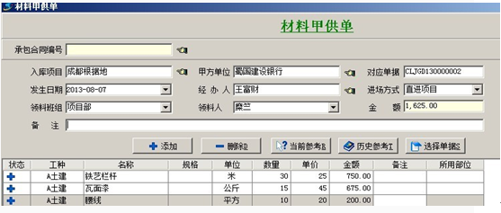 1. 【材料甲供單】這張單據(jù),是在甲供材料入場時(shí)填寫的業(yè)務(wù)單據(jù),填寫單據(jù)時(shí),進(jìn)場方式選擇直進(jìn)項(xiàng)目,則該批材料會直接進(jìn)入項(xiàng)目甲供成本。