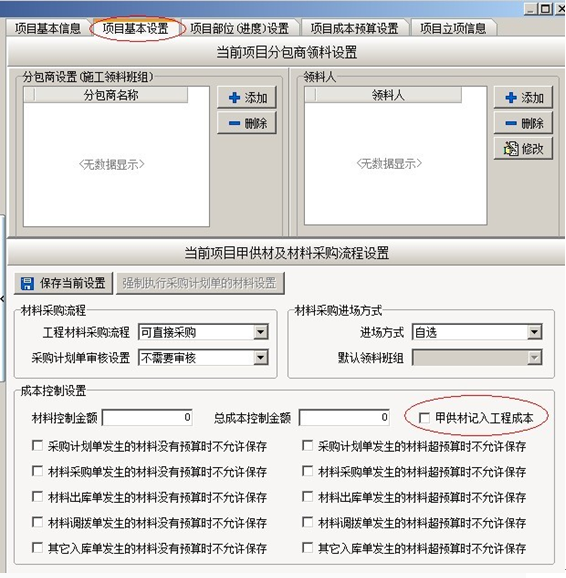 (二)、甲供材料,是項(xiàng)目所用材料由甲方公司提供。在默認(rèn)情況下甲供材不會統(tǒng)計(jì)入項(xiàng)目成本,如果用戶希望甲供材統(tǒng)計(jì)入項(xiàng)目成本,必須在項(xiàng)目維護(hù)中把相關(guān)開關(guān)打開,如下圖: