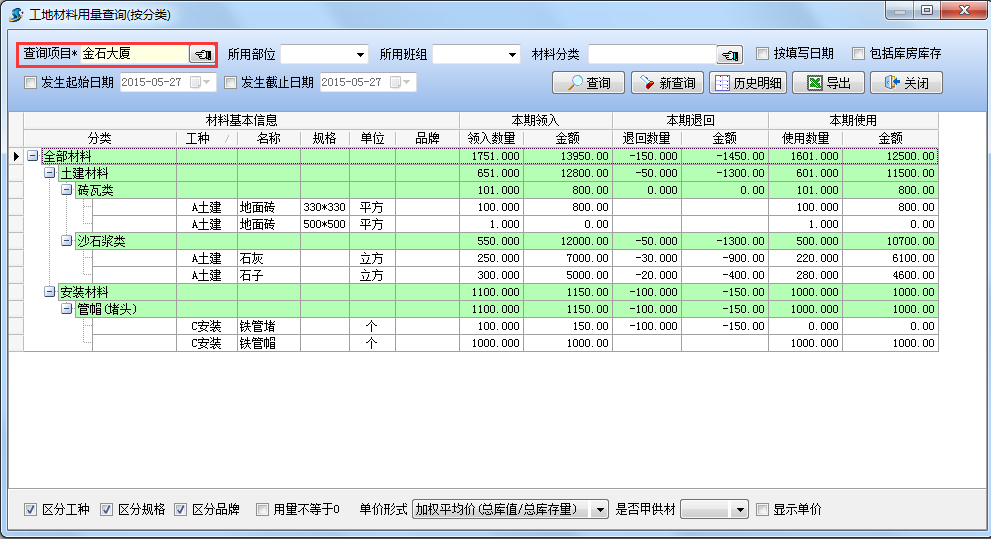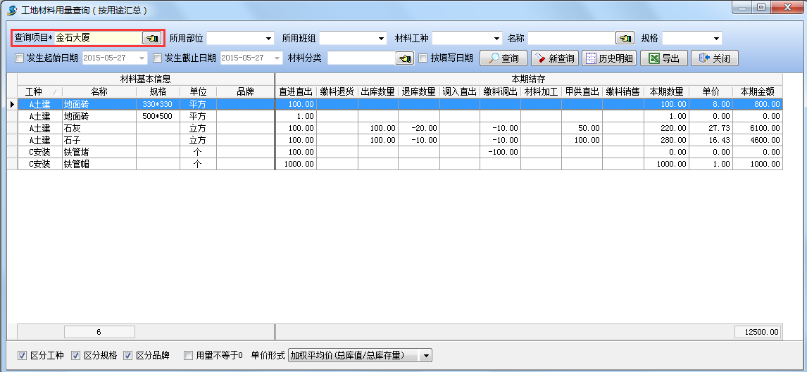 如下圖:查詢項目【金石大廈】所有石子的歷史明細,(通過【模糊查詢】)。
