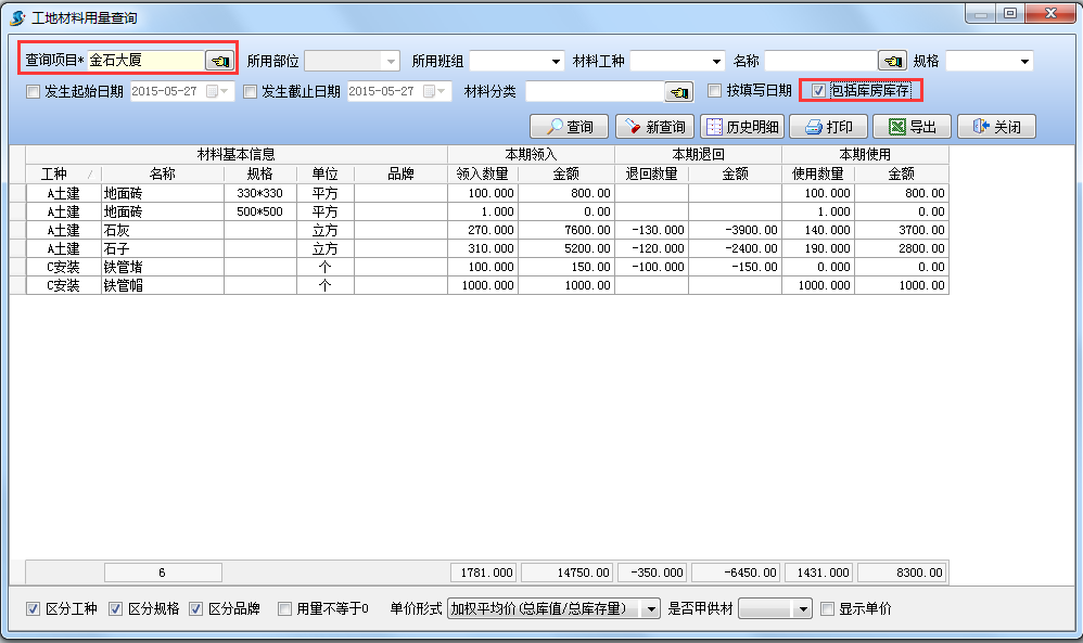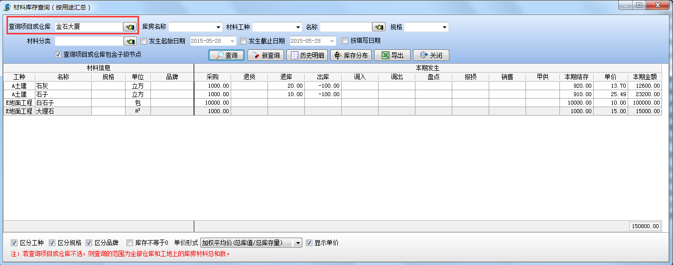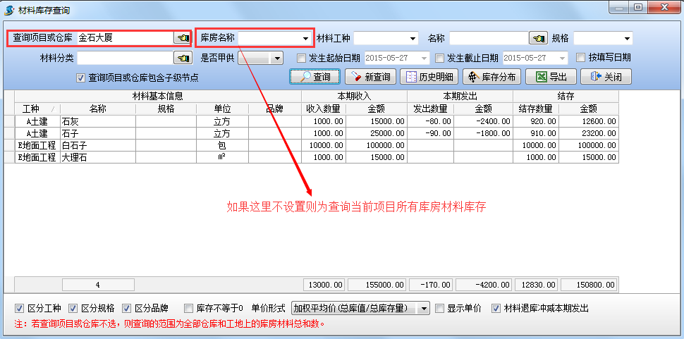 設(shè)置查詢項目為【金石大廈】,查詢結(jié)果如下圖:查詢當前項目【金石大樓】(包括所有庫房)的材料庫存情況。