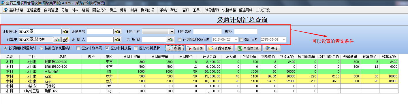 在工程項目管理系統(tǒng)中【采購計劃執(zhí)行匯總】 可以設(shè)置多重條件來匯總所有的【采購計劃單】的執(zhí)行情況,如下圖: