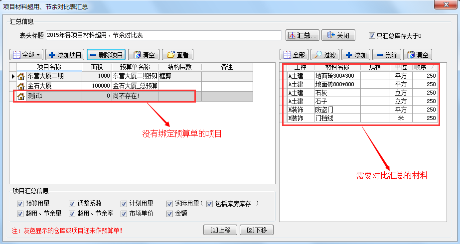 預(yù)算單材料名稱為基準的,而且預(yù)算單里區(qū)分了工種,所以需要將“匯總時區(qū)分材料工種”打鉤