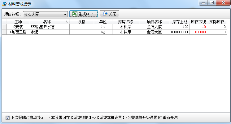 在工程項目管理系統(tǒng)中我們也可以設(shè)置登錄軟件時自動提示庫存警戒。設(shè)置好之后當材料的庫存量達到了預(yù)警設(shè)置中設(shè)置的上限或者下限,登錄時會自動彈出提示。