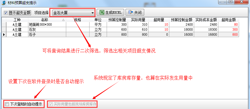 在工程項目管理系統(tǒng)中【材料超支預(yù)算提示】用來查詢所有項目的材料超支情況,包括量的超支和價的超支。如下圖: