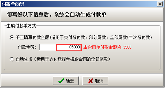 在工地現(xiàn)場材料管理過程中,如果工地現(xiàn)場采購大量材料需要簽訂采購合同并在到貨之前付預(yù)付款時,我們要在采購合同中,選中對應(yīng)的采購合同,點擊[合同付款及相關(guān)發(fā)票],點擊[執(zhí)行付款]-[手工填寫]彈出“付款申請單”,在“付款申請單”中選擇執(zhí)行“采購合同”,并選擇對應(yīng)的“合同編號”,選擇“支付方式”,選擇“付款名稱”為“訂貨款”,并在“付款金額”里面輸入“預(yù)付款”金額,“付款申請單”添加完成之后點擊[保存]的按鈕保存單據(jù),如圖:
