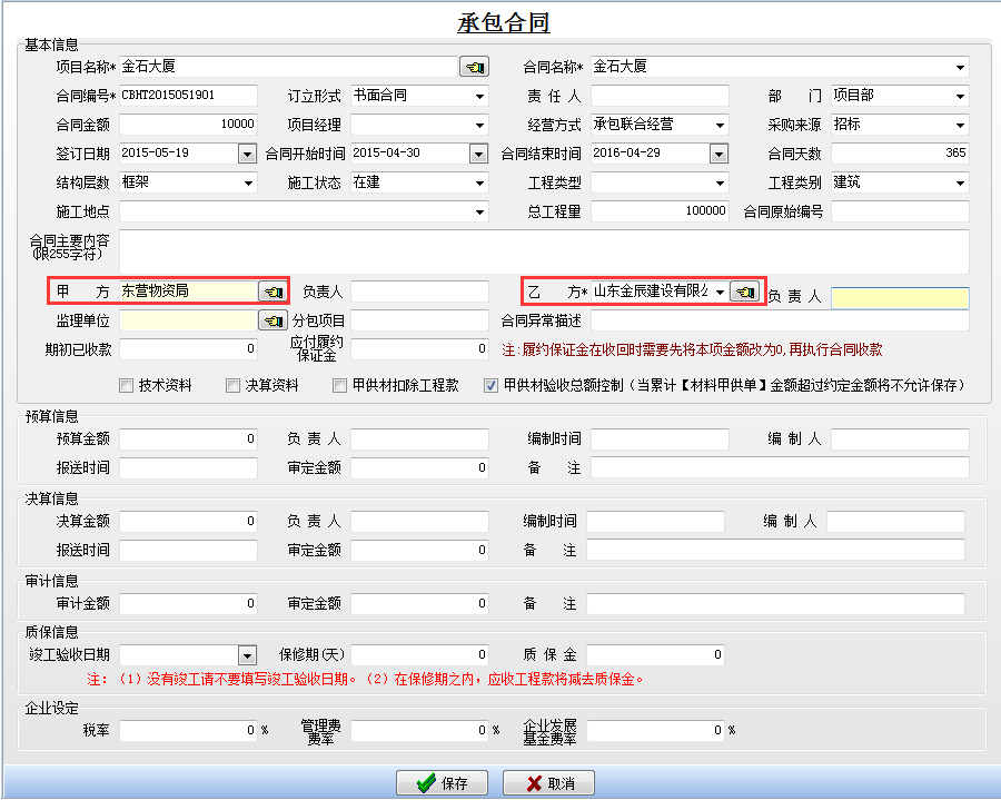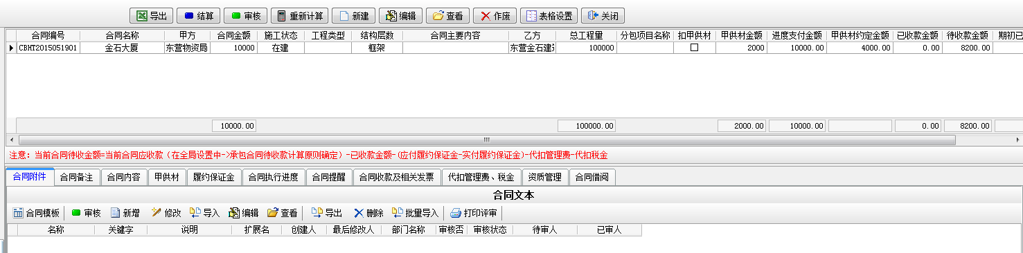 在工程項(xiàng)目資質(zhì)掛靠管理中因?yàn)榻栌靡曳?span style="font-family:Times New Roman;">B的資質(zhì),需要扣除管理費(fèi),如果需要乙方B代開發(fā)票還需要扣除稅金。在承包合同中[代扣管理費(fèi)稅金]模塊下操作,如下圖: