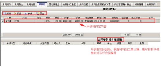 在“合同編輯”中左半部分是合同的分類,承包合同是按“項(xiàng)目維護(hù)”進(jìn)行分類管理的。一個(gè)項(xiàng)目下可以建立多個(gè)合同,窗口的右上部分是合同列表,如圖是項(xiàng)目[金石大樓]下的承包合同。一行信息代表一個(gè)合同。右下部位是當(dāng)前合同相關(guān)的內(nèi)容:“合同評(píng)審”、“合同借閱”、“資質(zhì)管理”、“甲供材”、“合同執(zhí)行進(jìn)度”、“履約保證金”、“合同收款”、“合同提醒”、“合同附件”、“合同備注”、“代扣管理費(fèi)稅金”。