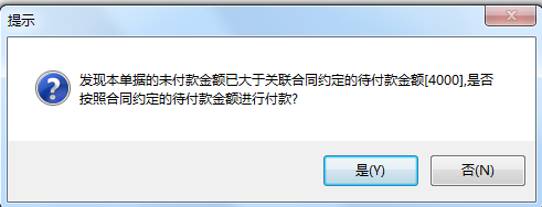 當(dāng)我們選擇是時(shí),生成付款為4000的付款申請(qǐng)單;當(dāng)選擇否時(shí),生成5000的付款申請(qǐng)單,當(dāng)保存單據(jù)時(shí)軟件也會(huì)提示超過(guò)了付款限額。如圖