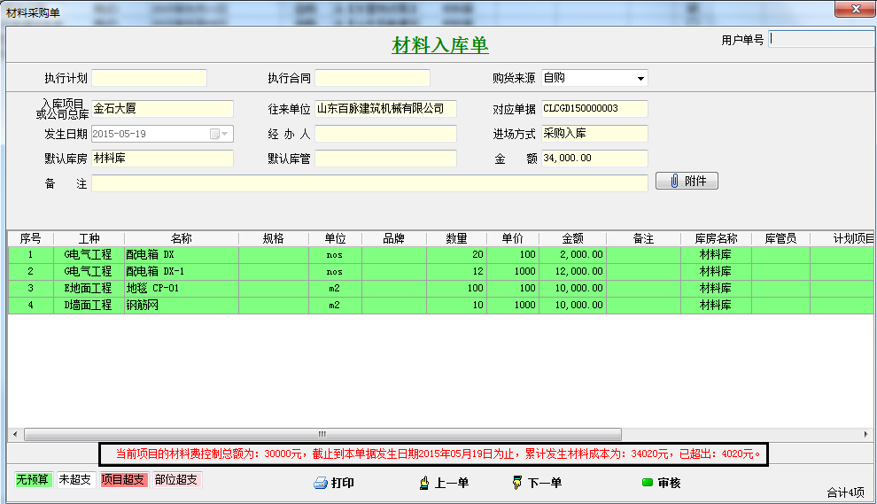 在工程項(xiàng)目管理系統(tǒng)中填入材料入庫(kù)單、其他入庫(kù)單成本控制金額,當(dāng)超過(guò)該金額時(shí),系統(tǒng)會(huì)自動(dòng)提示。假如我們成本控制金額填入30000我們?cè)谛落浫氩牧先霂?kù)單、其他入庫(kù)單時(shí)超過(guò)控制金額30000會(huì)自動(dòng)提示。這里咱們一采購(gòu)入庫(kù)單為例,如下圖
