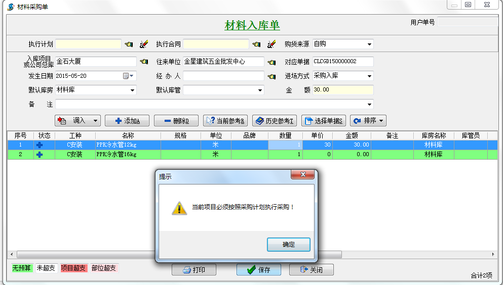 在工程項(xiàng)目管理系統(tǒng)中強(qiáng)制執(zhí)行采購(gòu)計(jì)劃單的材料如果該材料沒(méi)有工程項(xiàng)目采購(gòu)計(jì)劃單時(shí)材料采購(gòu)單是不允許保存的。