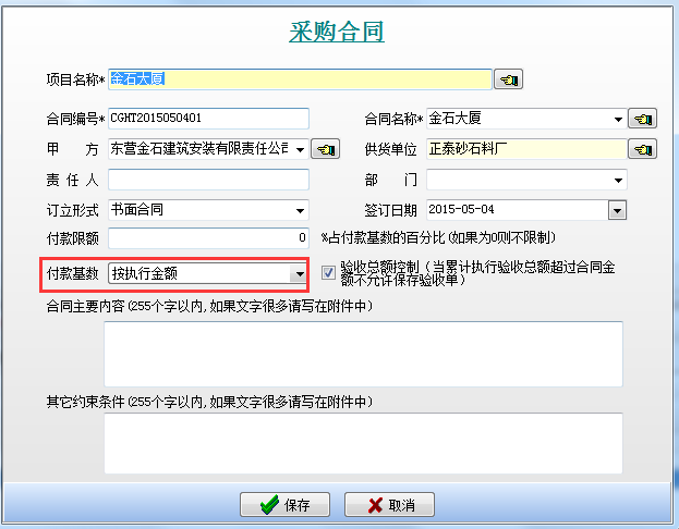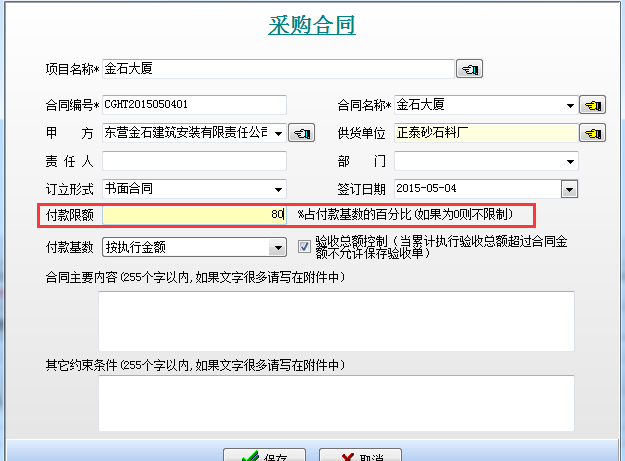 即在工程項(xiàng)目管理系統(tǒng)中新建采購(gòu)合同時(shí)填寫(xiě)好付款限額。如下圖: