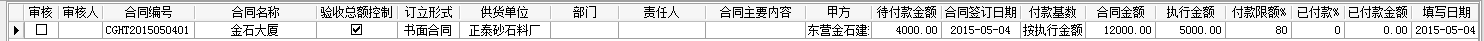 我們建立一個(gè)總價(jià)為12000的采購(gòu)合同,付款基數(shù)按執(zhí)行金額,付款限額為80%。如下圖