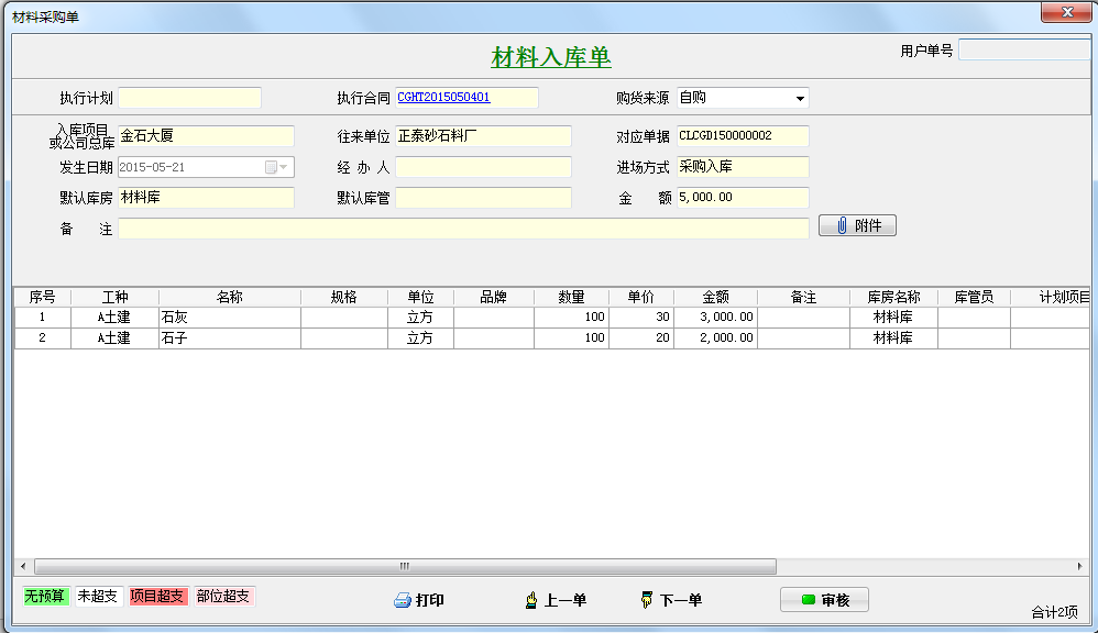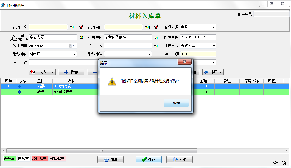 在填寫(xiě)工程項(xiàng)目采購(gòu)計(jì)劃單,材料入庫(kù)單,材料出庫(kù)單,材料調(diào)撥單時(shí)都會(huì)根據(jù)預(yù)算單來(lái)進(jìn)行相應(yīng)的顏色提示。