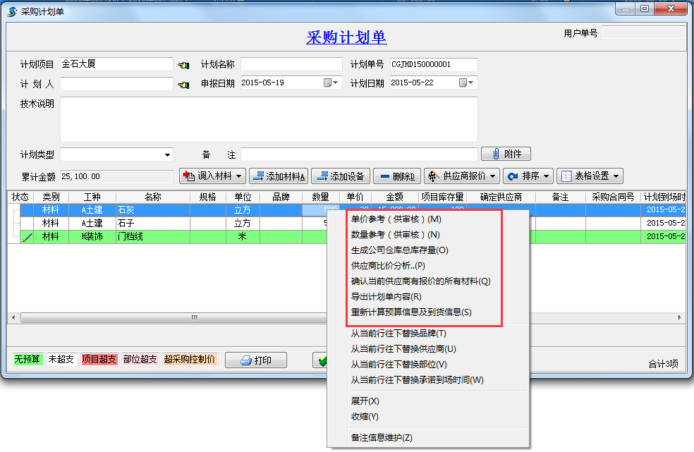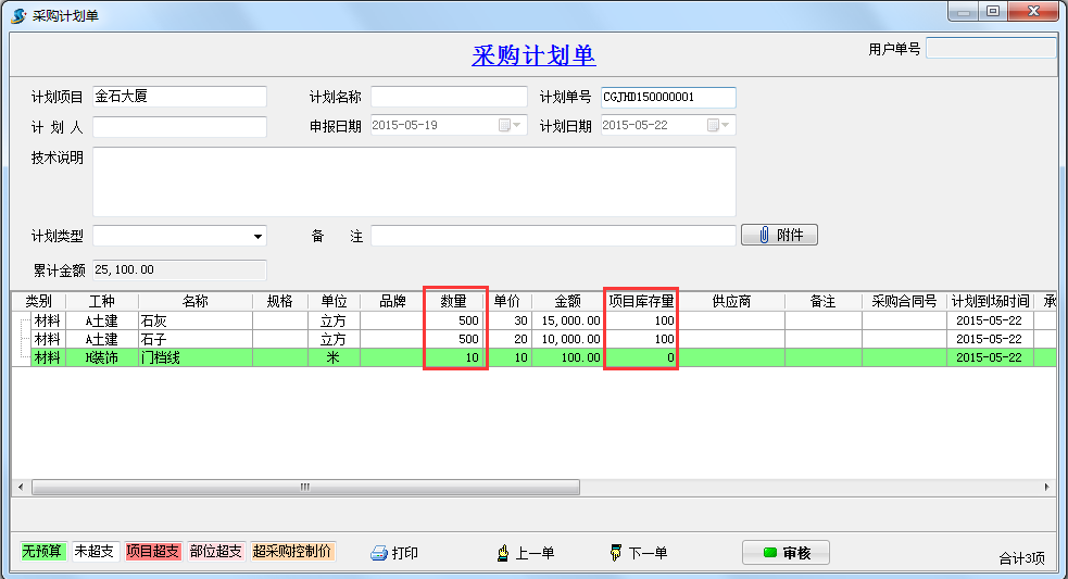 綁定好項(xiàng)目之后,在填寫(xiě)材料相關(guān)單據(jù)時(shí),會(huì)根據(jù)預(yù)算單的價(jià)格和數(shù)量進(jìn)行不同顏色的顯示。這里我們以采購(gòu)計(jì)劃單為例進(jìn)行說(shuō)明。