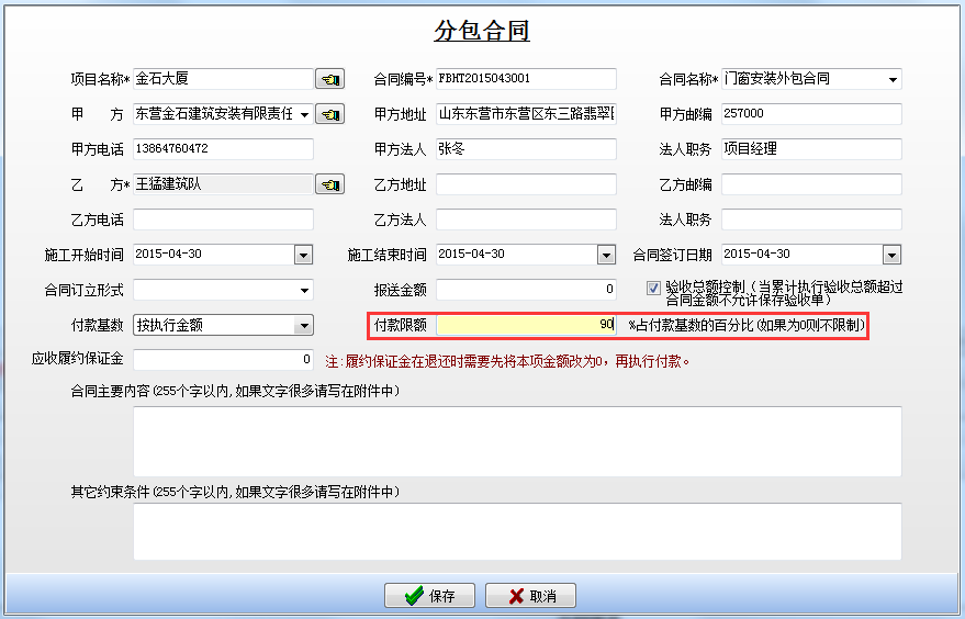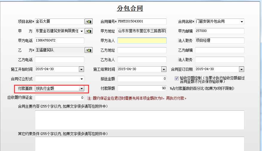 即在新建分包合同時(shí)填寫(xiě)好付款限額。如下圖: