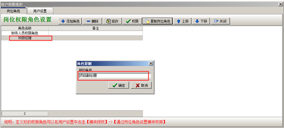 如果建立的新的崗位角色跟目前系統(tǒng)中現(xiàn)有的崗位角色擁有同樣的系統(tǒng)操作權限,可選中當前崗位角色,點擊“復制崗位角色”的按鈕,復制完成之后,新的崗位角色跟當前崗位角色擁有同樣的系統(tǒng)操作權限,如圖: