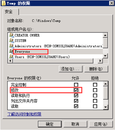 第三步,選中對(duì)象“Everyone”,并在權(quán)限中勾選“修改”對(duì)應(yīng)的“允許”復(fù)選框。點(diǎn)擊“應(yīng)用”及“確定”按鈕,如圖;
