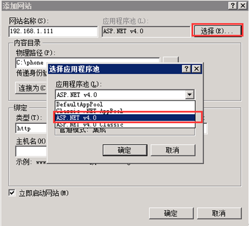 選擇好應(yīng)用程序池為 Asp.net 4.0。如圖: