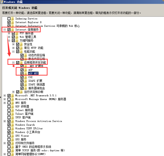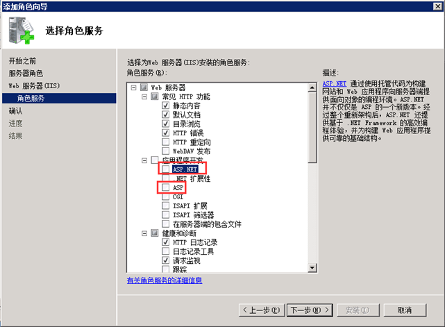 第四步:在服務(wù)中選擇“Asp.net服務(wù)”以及“Asp”服務(wù)。如圖: