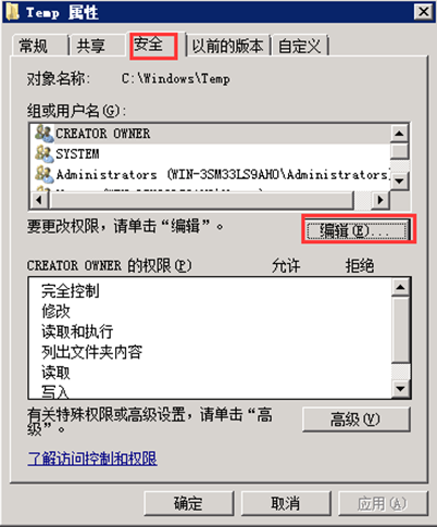 第二步,在彈出的對(duì)話框中點(diǎn)擊“安全”,并點(diǎn)擊“編輯”,輸入對(duì)象名為“Everyone”。如圖: