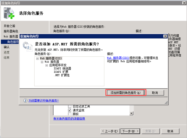第三步,在彈出的對(duì)話框中,勾選“Asp.net服務(wù)”以及“Asp”服務(wù),點(diǎn)擊確定。如圖: