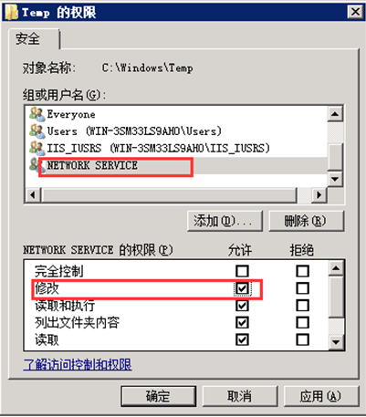 第五步,同樣的方法添加對(duì)象名“network service”并開放“修改”權(quán)限。如圖: