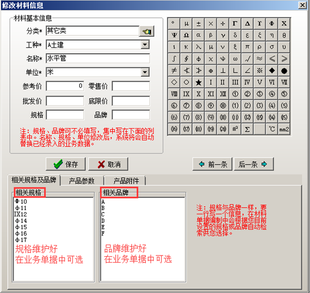 點(diǎn)擊“新增”或“修改”的按鈕來編輯材料信息,在進(jìn)行材料基本信息編輯時(shí),可進(jìn)行相關(guān)規(guī)格以及相關(guān)品牌的維護(hù),對應(yīng)的規(guī)格及品牌維護(hù)完成在系統(tǒng)的業(yè)務(wù)單據(jù)中可選,這樣可避免同種材料在系統(tǒng)中生成多條記錄的麻煩。如圖: