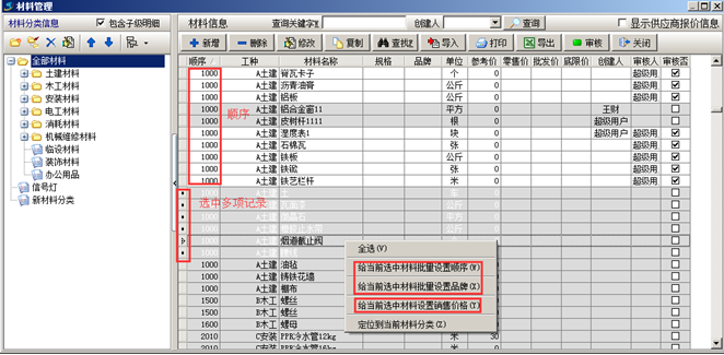 材料信息的順序及品牌也可進(jìn)行批量設(shè)置
